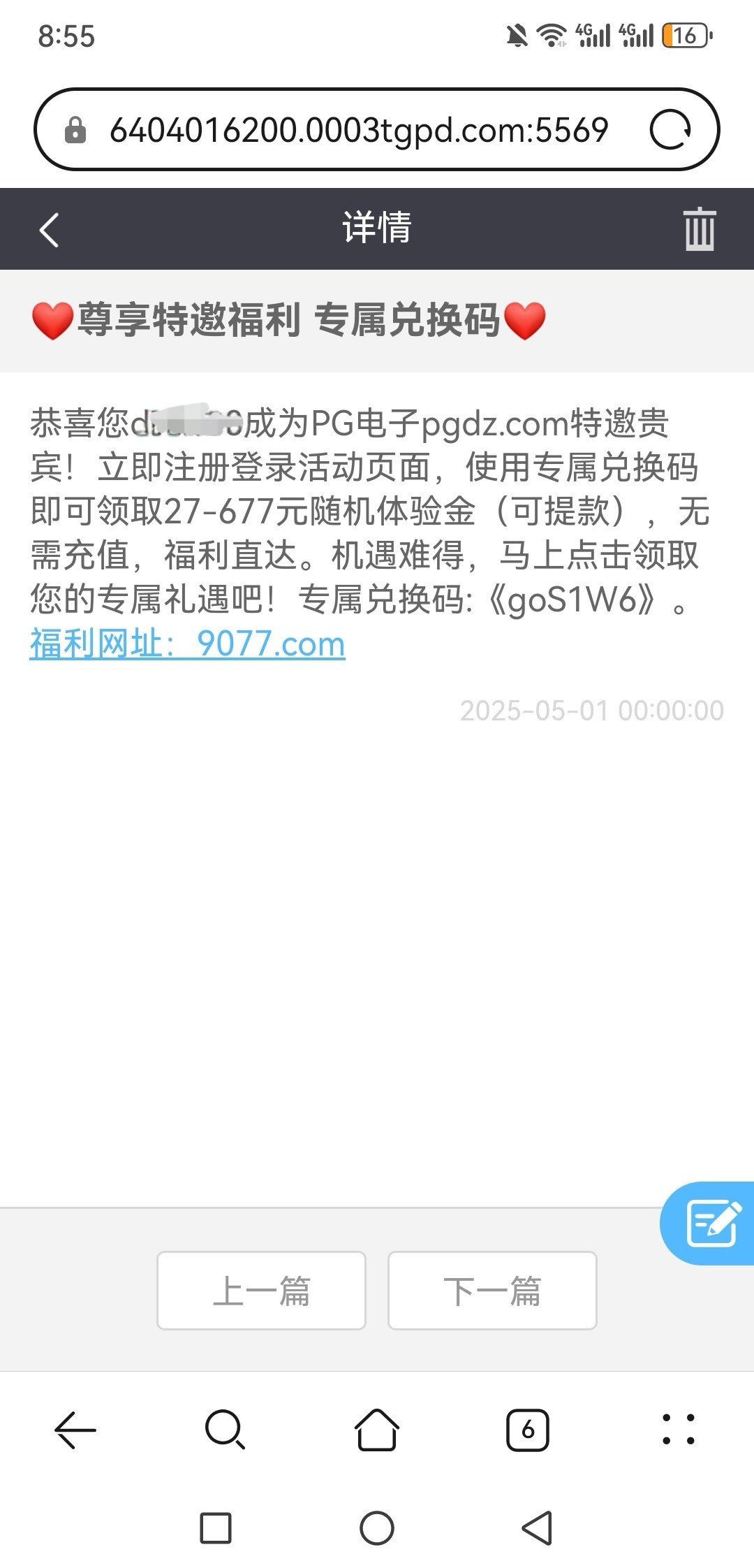 有号的都去看看站内信基本都有677pg电子特邀兑换码直接兑换,我领到了一点水没有。还有51历史注册vip等级活动我申请秒到…这个应该是可以直接提款的我一把没了可惜  9077.com