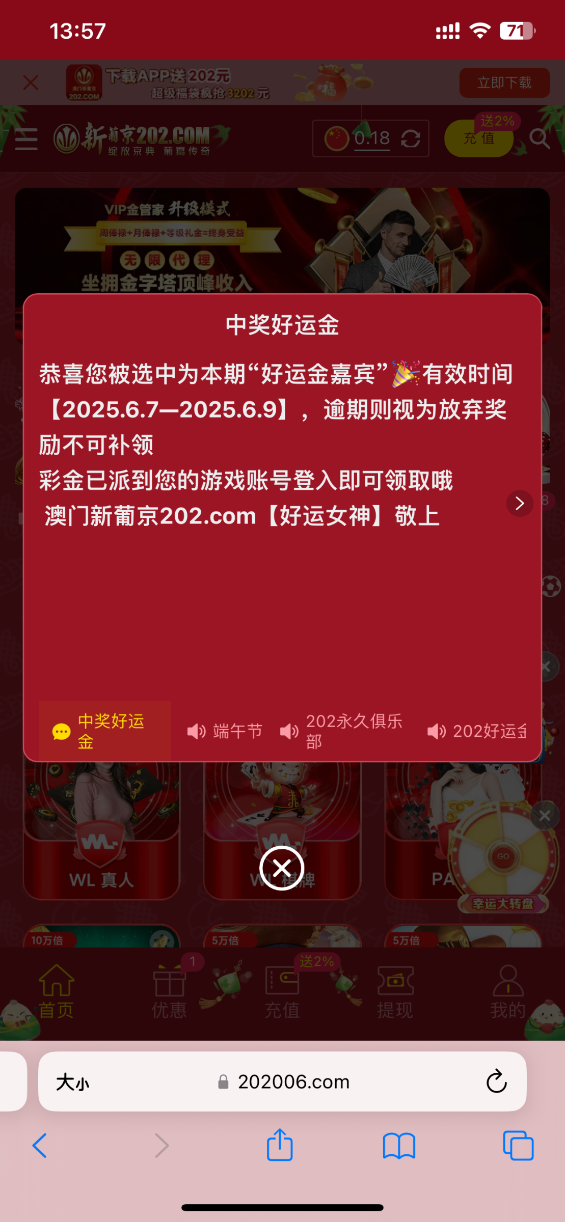 登录就在待领取里,机器人也有打电话来,地址 202006.com 以前充值过,有号的看看咯